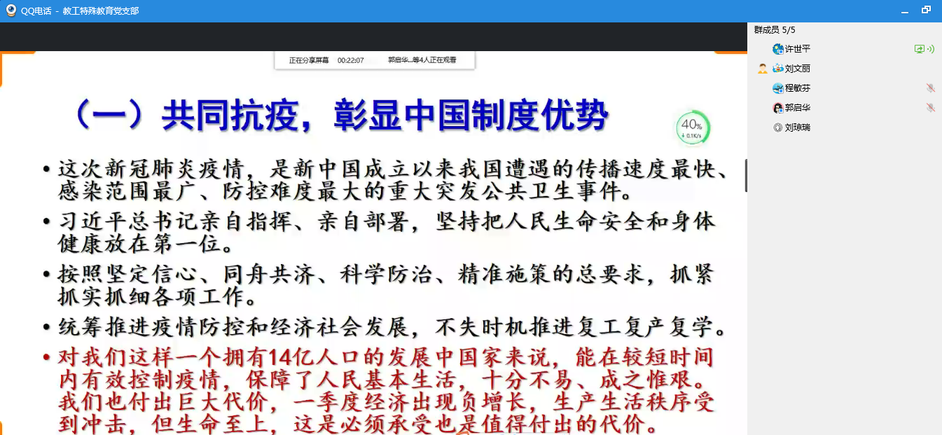 630日下午,学院党委副书记许世平在会议室J202进行了题为“学习领会2020年‘两会’精神”的主题党课,教工特殊教育教研室党支部和机关党支部的所有教工党员参与学习,此次党课采取线上线下相结合的方式进行。