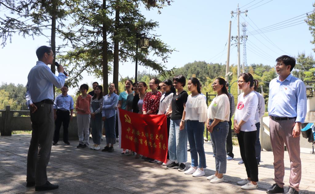 “请水寨暴动是安徽省书记王步文亲自发动,王效亭师长担任总指挥的、一场影响巨大、意义深远的无产阶级伟大革命斗争。起义活动于潜、岳、英、怀、太、霍、舒、桐八县,建立了1000多人的红军独立师,开辟了15000平方公里的根据地,建立了安徽省最早的红色政权之一——潜山县革命委员会,坚持斗争七个月之久,是土地革命时期鄂豫皖四大起义之一”。学院党委书记陈志超向全体党员详细讲解请水寨暴动的发生背景、组织领导、暴动过程、革命意义,深情追忆革命先烈为人民舍生忘死、为民族前赴后继的光辉历程。