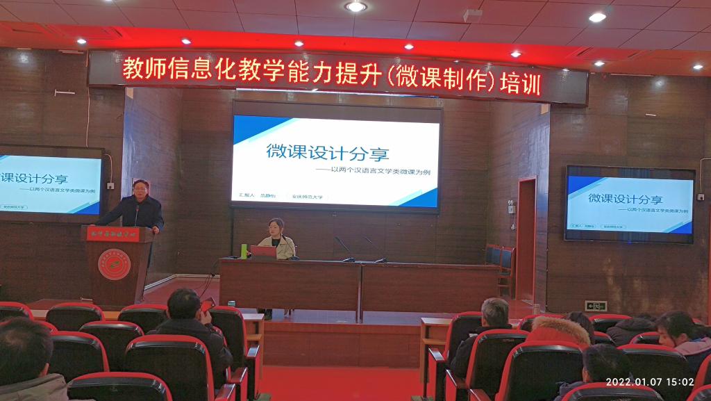 1月7日,应安徽省怀宁县职教中心(安庆市宜城科技学校)邀请,我院教育技术学教研室主任韦伟、2019级本科生范静怡赴怀宁开展“教师信息化教学能力提升(微课制作)培训”。怀宁县职教中心校长郝浩军主持培训会,该中心100余名教师参加了培训。