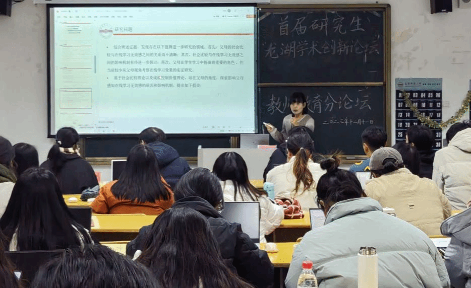 朱斌彬博士和宋欣博士作为教师代表,现场分享了题为《学术观,观学术》和《父母辅导焦虑与学生在线学习关系探讨——基于社会比较理论视角》的主旨报告。朱斌彬博士以“观”为切入点,强调在论文中也要做到“学、问、思、辨、行”。宋欣博士强调了在实证研究中一定要注意信、效度检验,只有研究工具有可信度,研究结果才能得到认可。