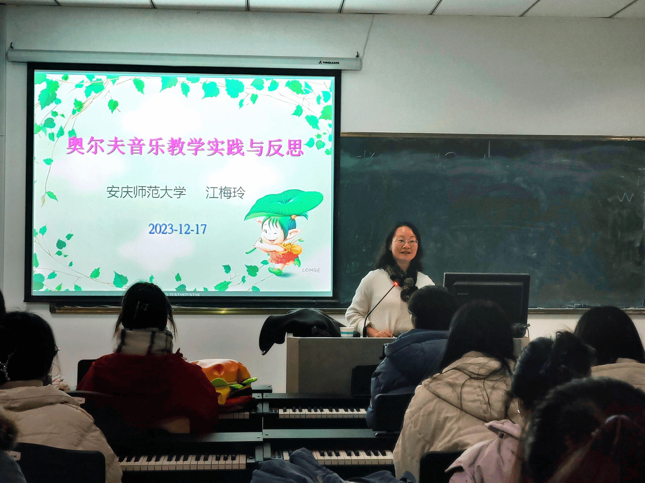 江老师介绍奥尔夫教学法是一种先进而独特的音乐教学法,倡导参与,鼓励想象,以节奏为基础,即兴创编,结合身体律动,将唱、奏、动、听综合运用,将动作、舞蹈和语言等联系在一起,唤起学生对学习音乐的兴趣,激发他们对生活的情感,培养学生与人合作交往能力。随后,江老师通过歌曲的弹奏演绎,讲解了一些在练习中容易出现的问题。最后,江梅玲老师对同学们提出专业学习建议,鼓励大家在实践中不断提升自己的专业素养。