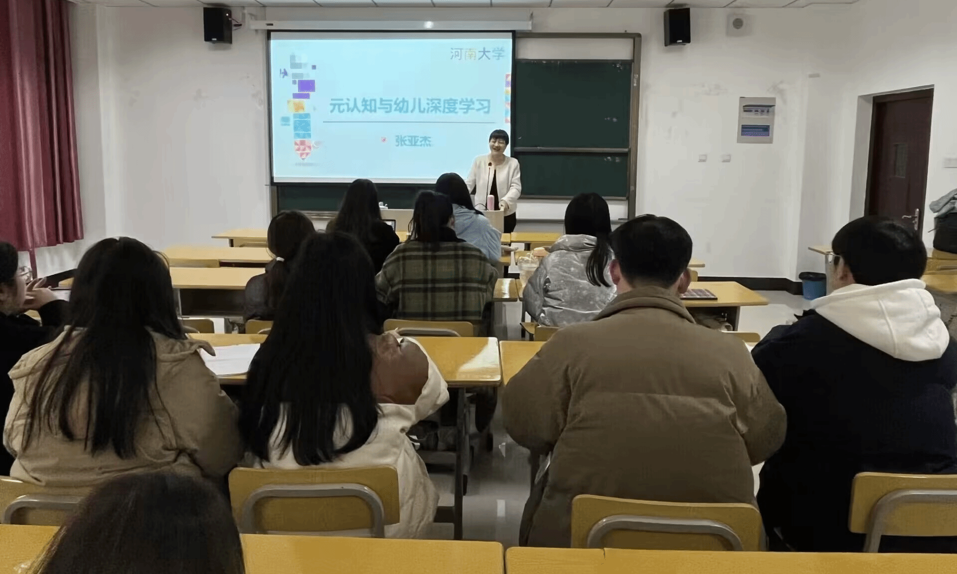 2月22日上午,河南大学教育学院学前教育系主任张亚杰副教授应邀在“红色园丁大讲坛”作报告,开展了题为“元认知与幼儿的深度学习”的学术交流会,必赢bwin线路检测中心谢红玉老师主持报告会,必赢bwin线路检测中心学前教育全体专业研究生及部分教师现场聆听。
