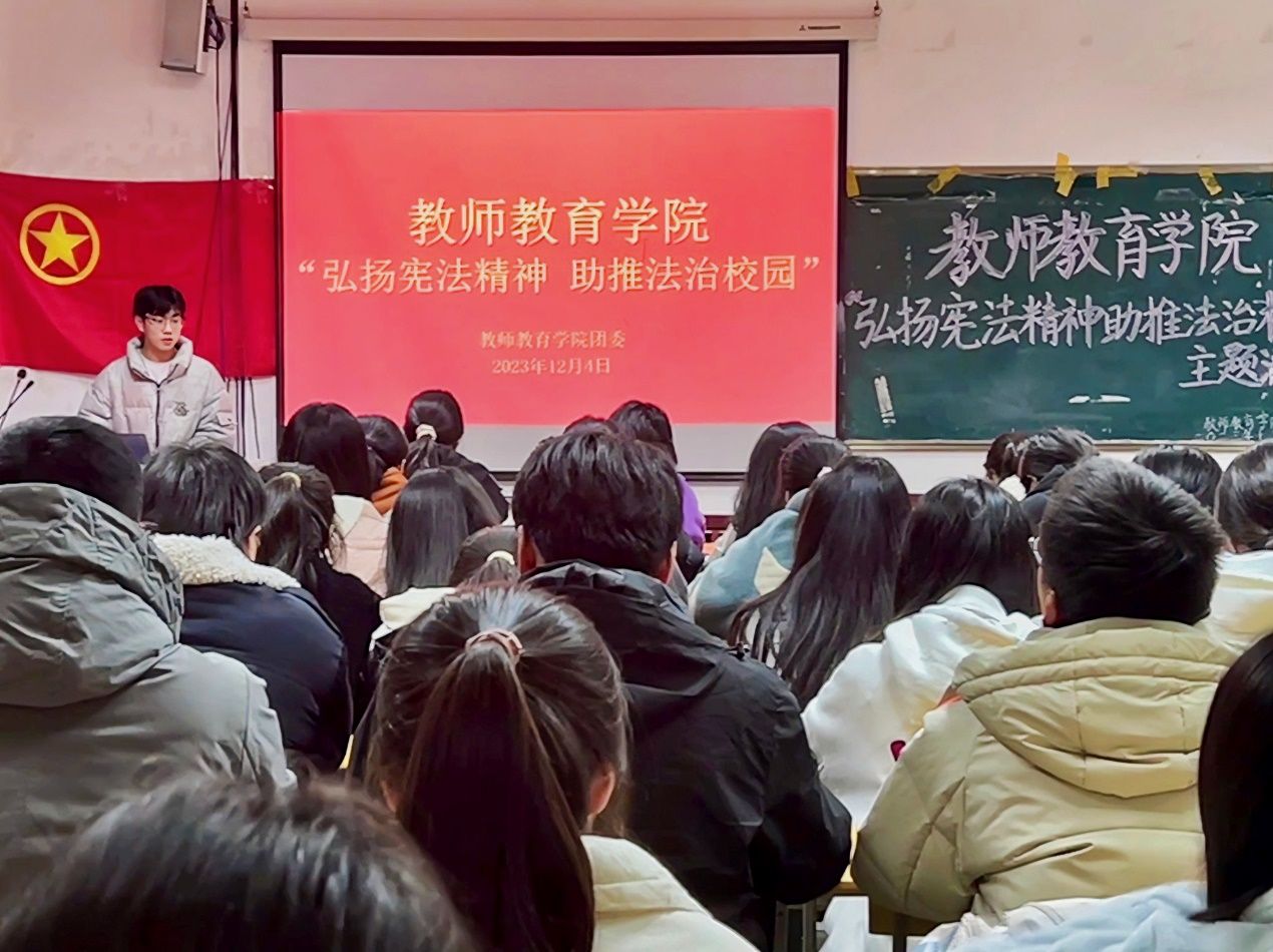 12月4日,我院于J305教室开展“弘扬宪法精神,助推法治校园”主题活动。院团委实践委员叶伊林担任主持,学院八十余名学子到场参加。
