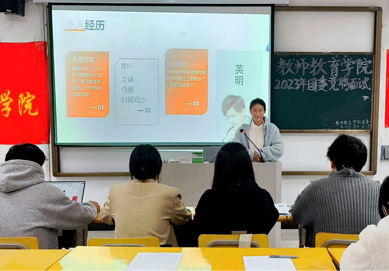11月15日下午,我院在J214教室举行2023年团委竞聘面试。院团委负责老师姚强诚、学生副书记章玥、俞燕,团委实践委员鲍雨蔷、袁畅、熊远志,主席团主席助理李海博、洪俊杰出席面试,30余名学生代表到场参加。