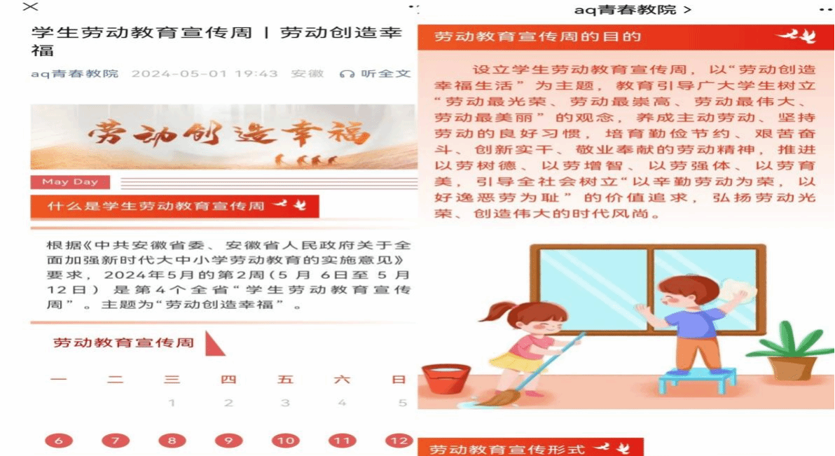 一是开展一次劳动教育集中宣传。学院网页和微信公众号等新媒体第一时间宣传推介劳动教育宣传周相关知识,在全院营造尊重劳动、崇尚劳动的良好氛围。