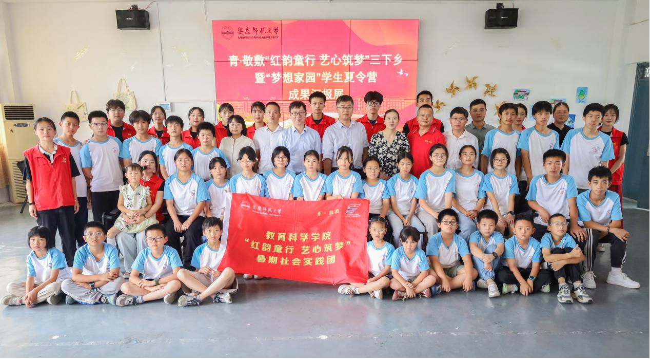 7月12日,“红韵童行,艺心筑梦”三下乡社会实践团暨“梦想家园”学生夏令营结营仪式在宿松县兴宇劳动教育综合实践基地举行,安庆师范大学校团委副书记严峻,教育科学学院党委副书记、纪委书记许世平,教师刘旭、郭静文,宿松县委组织部、团县委、宿松县号仁学会、宿松义工协会等单位代表和安庆师范大学“三下乡”社会实践团成员及31名夏令营营员参加仪式。