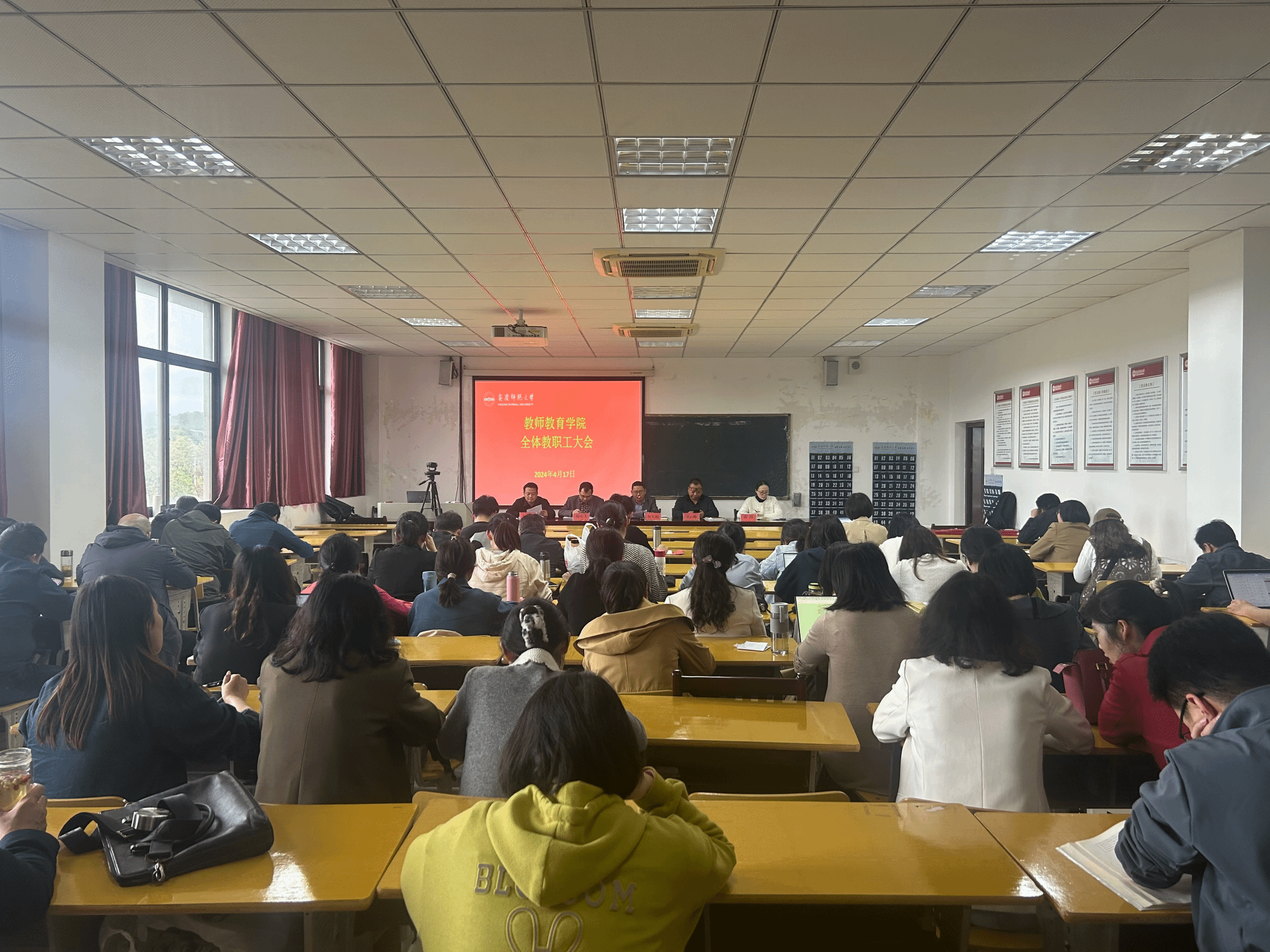4月17日,必赢bwin线路检测中心在J305教室召开全体教职工大会,贯彻落实学校本科教育教学审核评估迎评动员大会精神,部署推进学院审核评估工作。会议由学院党委书记何孔蛟主持,全体教职工参加会议。
