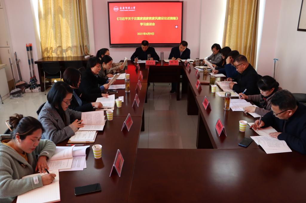 4月9日,必赢bwin线路检测中心组织安庆家庭教育研究指导中心部分研究人员召开《习近平关于注重家庭家教家风建设论述摘编》学习座谈会,安庆市妇联主席焦玲、副主席张莉、我校“女生工作坊”负责人陈银凤应邀出席会议。安庆教育研究指导中心理事会成员和学术委员会委员参加会议,会议还邀请了安庆市委党校、安庆市家庭教育讲师团部分教师参加会议。